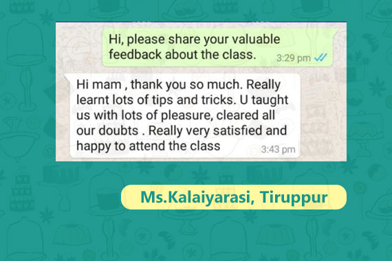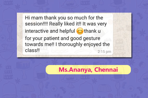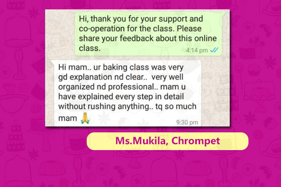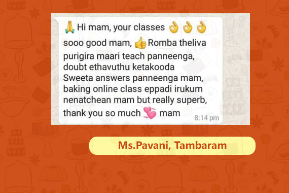 Your baking cllass was totally enriching and gainful.The concepts are explained in detail and all doubts are cleared. With this message I would like to appreciate your work. You are teaching with Great patience and love which is really appreciable.
