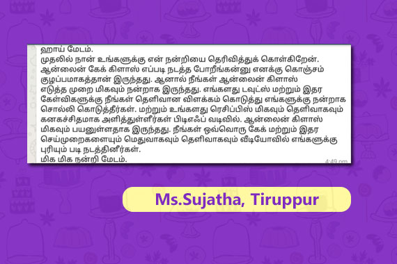 Presently we offer classes only in Tamil.